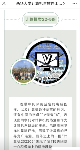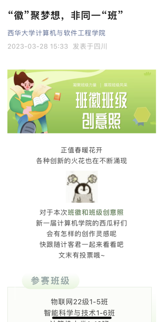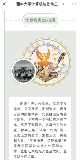 为了进一步增强学生的凝聚力和创造力,充分展现当代大学生积极向上的精神风貌,2023年3月23日,计算机与软件工程学院2022级全体班级组织开展“班级风貌创意集体照暨班徽设计大赛”活动。
