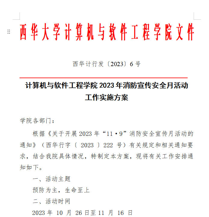 学院领导高度重视,召开专题会议,讨论制订了《计算机与软件工程学院2023年消防宣传安全月活动工作实施方案》(西华计行发〔2023〕6号)印发全院各系室中心,并督促各系室中心按照实施方案的安排和要求,落地落实,务求实效。