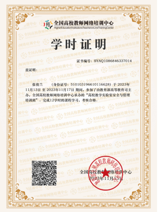 二是实验中心按照上级《关于举办高校教学实验室安全与管理培训班的通知》的相关要求,组织实验室教师于11 月 10 日前登录平台完成了注册,参加了11月13-17日的在线培训,通过了在线测试获得培训班学时证明。