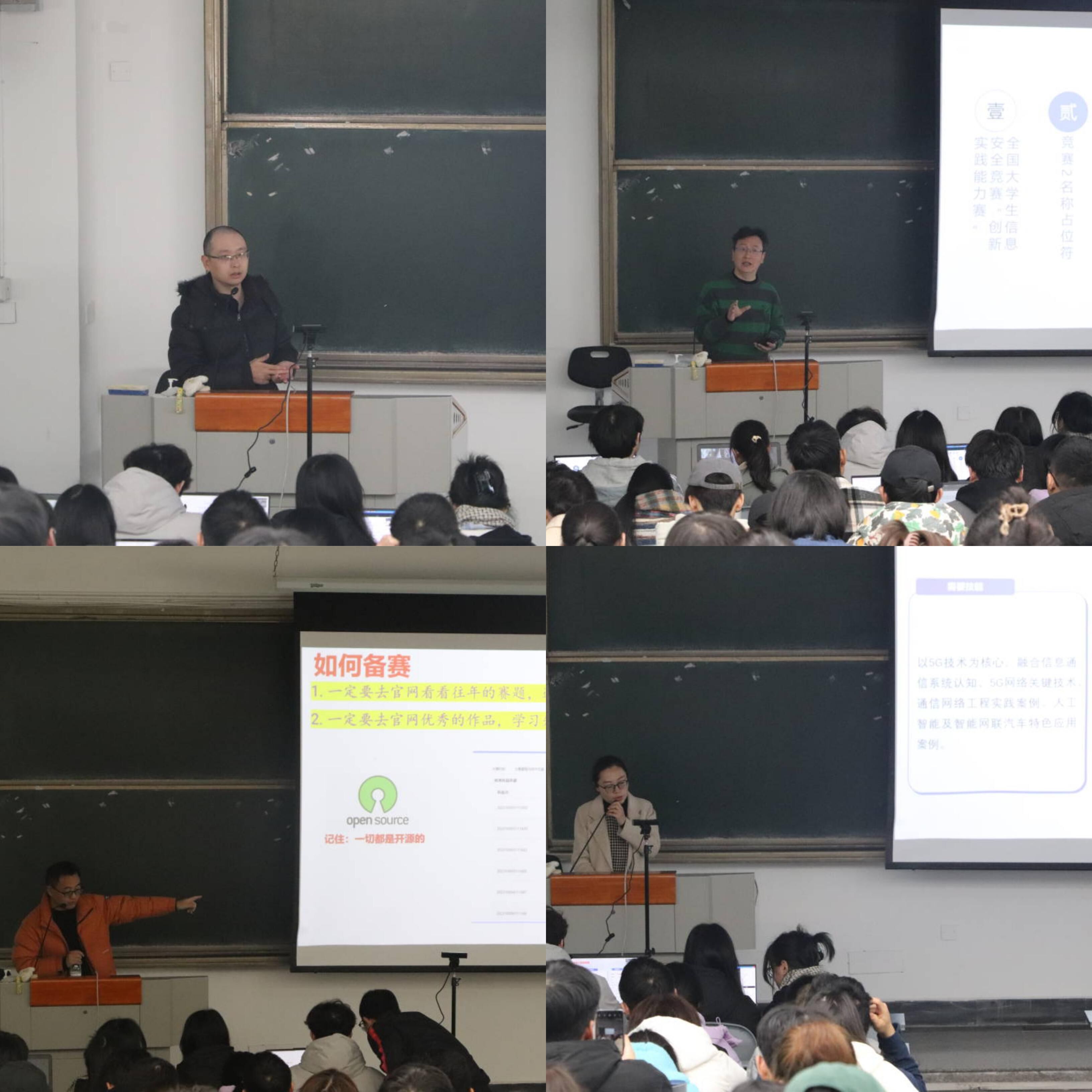 刘克剑副院长指出学院第一次大规模组织学科竞赛宣讲,是为了让同学们更好的找到专业实践的切入点,找到团队,能够在竞赛中锤炼专业技能。“互联网+”省级金牌教练、信息安全系主任熊玲,竞赛优秀指导老师王秀华、周立章、陈红红、纪四维、钟建、夏梅宸、周恩治、陈娟共9位老师重点介绍了2023年全国普通高校大学生竞赛排行榜中与学院各学科相关的竞赛。各位老师从“互联网+”,挑战杯,“ACM”,“蓝桥杯”,全国大学生软件测试大赛,全国大学生计算机系统能力大赛等竞赛的背景、模式、组织方式、学院的团队现状以及如何进行训练等方面进行了详细的介绍。