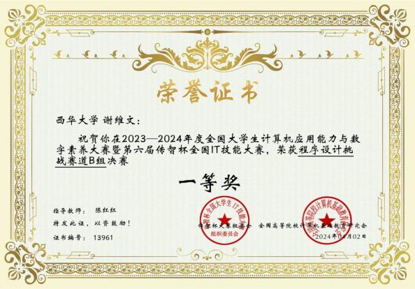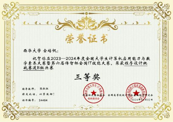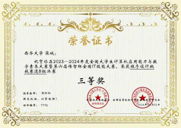 近日,我校计算机与软件工程学院学生在第六届传智杯全国IT技能大赛—程序设计挑战赛全国总决赛中,取得优异成绩。其中,谢维文同学荣获全国一等奖,周世阳、李绍杰同学荣获全国二等奖,梁城、金培帆同学荣获全国三等奖,指导老师陈红红荣获优秀指导教师。