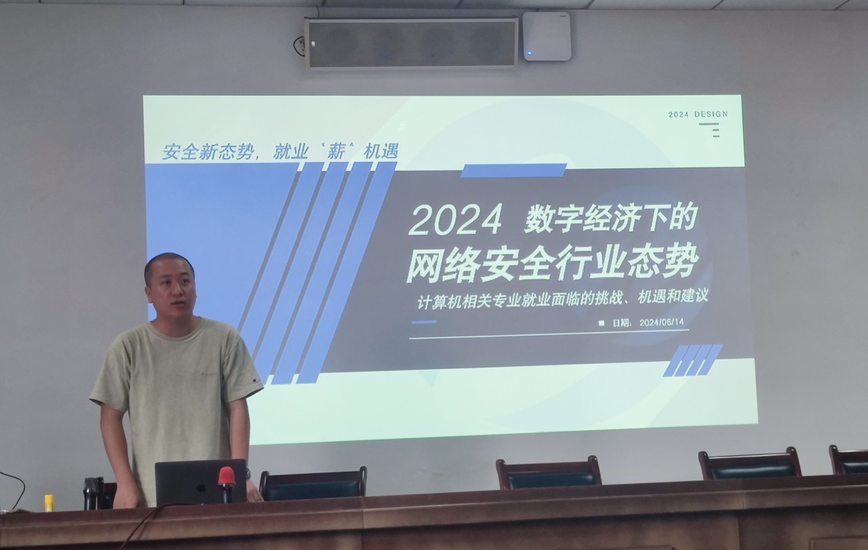 在就业板块,学院邀请了来自奇安信的技术专家杜洋为同学们做了题为“安全新形态,就业新机遇”的主题报告,分析了当前安全领域的最新形势,指出了计算机专业就业面临的挑战,并给出应对建议。