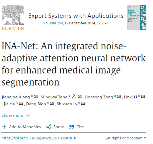 论文3:INA-Net: An Integrated Noise-Adaptive Attention Neural Network for Enhanced Medical Image Segmentation在国际顶级学术期刊《Expert Systems with Applications》上发表。该期刊是中科院SCI分区一区,TOP期刊。论文第一作者2022级研究生熊健乔,研究生指导老师为宗莲松副教授,通讯作者为唐明伟教授。