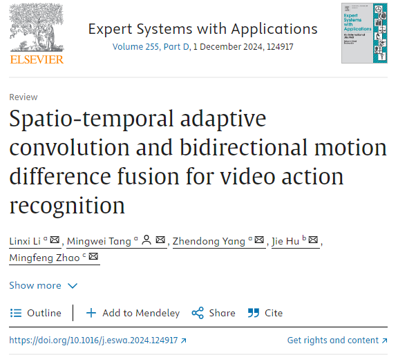 论文1:Spatio-Temporal Adaptive Convolution and Bidirectional Motion Difference Fusion for Video Action Recognition发表在国际Top期刊《EXPERT SYSTEMS WITH APPLICATIONS》。第一作者为2023级研究生李林熹,唐明伟教授为通讯作者。