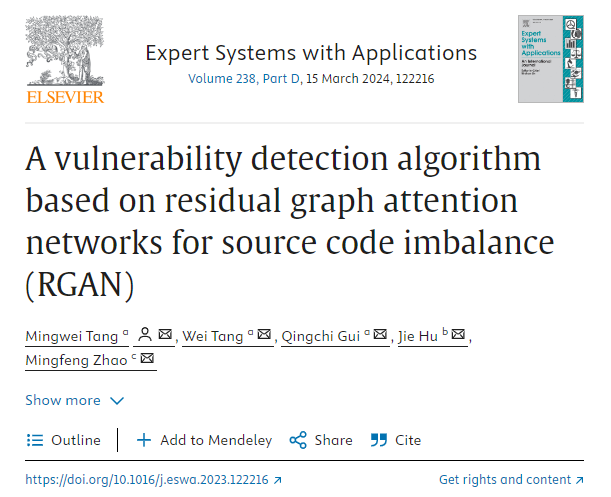 论文4: A vulnerability detection algorithm based on residual graph attention networks for source code imbalance (RGAN)在国际顶级学术期刊《Expert Systems with Applications》上发表。论文第一和通讯作者为唐明伟教授,第二作者为研究生唐威。