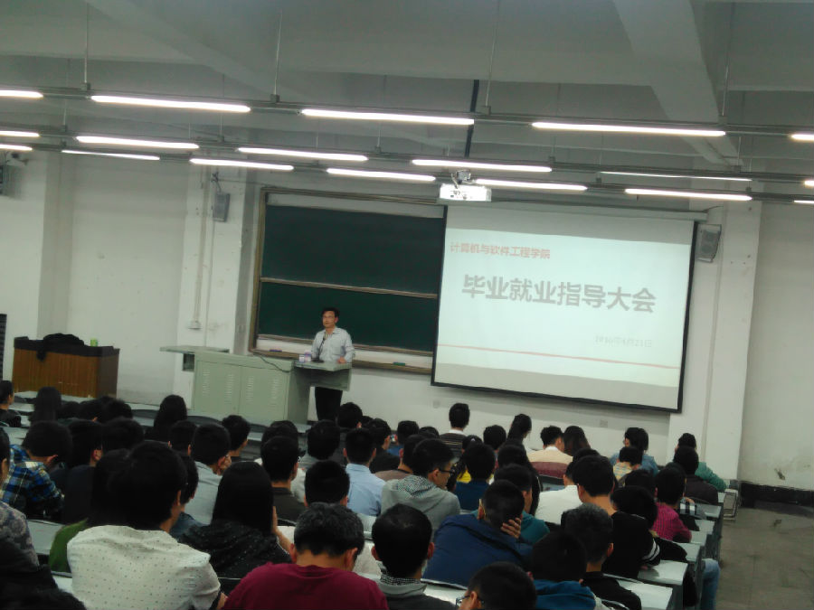 4月21日下午3:00,计算机与软件工程学院在六教B108教室举办2013级全体学生就业、考研动员大会。毕书记、各班辅导员、以及蓝桥杯组委会刘主任等出席了本次会议,2013级全体学生参加了会议。