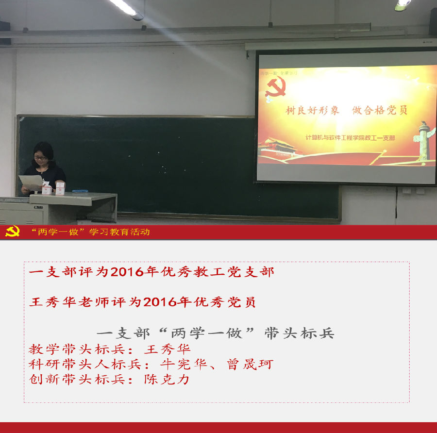 623日下午,计算机与软件工程学院教工一支部结合建党95周年纪念活动,紧扣“两学一做”学习教育主题,支部书记魏冬梅在6C-227教室为支部全体党员上了主题为“树良好形象,做合格党员”的党课。