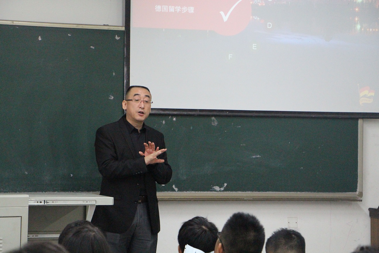 “毕业后准备做什么?”“为什么选择留学?”“选择学校需要考虑的因素。”一开场董云老师便抛给同学们三个问题。可能大多数同学都认为大学毕业后就可以顺利的拿到一份工作,可是面对当前就业形势,本科生就业率越来越低,工资也是越来越少。讲到留学时,他指出在选择学校层面,首要考虑的自然是好就业,其次是考虑费用问题,最后才是教学质量。关于德国留学的项目,他讲到,从经济方面来说,德国是与中国贸易最好的国家。从科技方面来说,世界大多核心技术是出自于德国,尤其是电子设备方面。从消费角度来说,相比于美国一年几十万的留学费用,在德国可以用这笔钱读四年。当然,在众多优势的情况下,能够到德国德累斯顿工业大学留学的条件也是非常苛刻的,其要求任何一门科目分数必须达到82分,德语必须达到B水平。