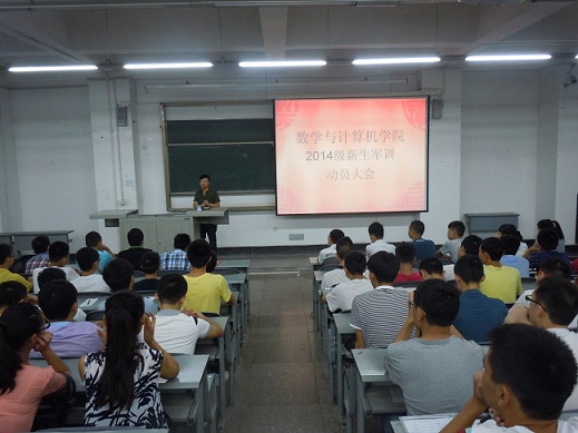 9月16上午,数学与计算机学院在6B208召开2014级新生军训动员大会。参加会议的人员有:学院党委副书记、副院长毕达平,军训指导员李贵春、刘凤丽,2014级辅导员郭聪,以及全体499名新同学。