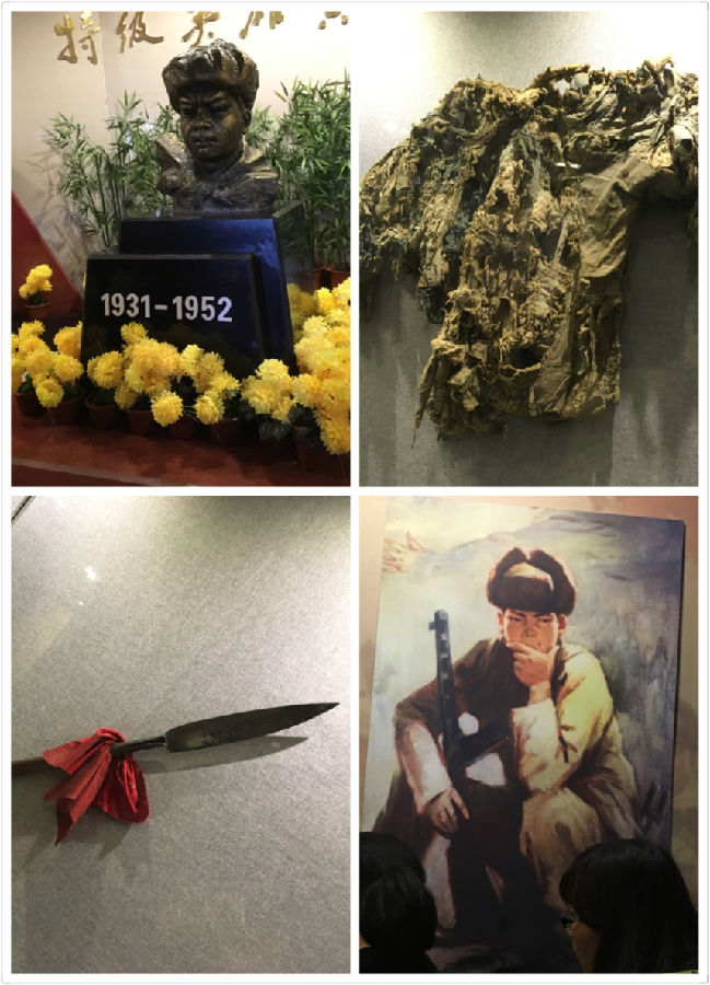 解说员带领大家依次参观了英雄的家庭、抗美援朝等主题展览,在模拟沙盘上讲解了上甘岭战役,大家专注地观看着纪念馆里陈列着的一件件珍贵展品:一家人仅有的一件破棉袄、英雄当儿童团员时站岗用的红缨枪、踏上朝鲜土地保家卫国身背的挎包、毛主席接见黄妈妈的合影、等等……,在讲解员激情的讲解中,大家重温了那段战火纷飞的艰苦年代,深情地缅怀了黄继光烈士的一生和他的英雄事迹。