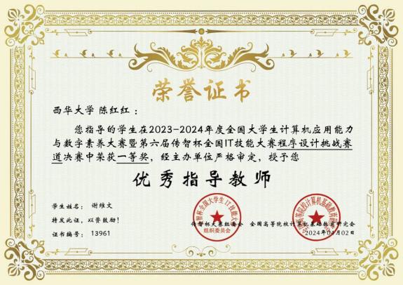 近日,我校计算机与软件工程学院学生在第六届传智杯全国IT技能大赛—程序设计挑战赛全国总决赛中,取得优异成绩。其中,谢维文同学荣获全国一等奖,周世阳、李绍杰同学荣获全国二等奖,梁城、金培帆同学荣获全国三等奖,指导老师陈红红荣获优秀指导教师。