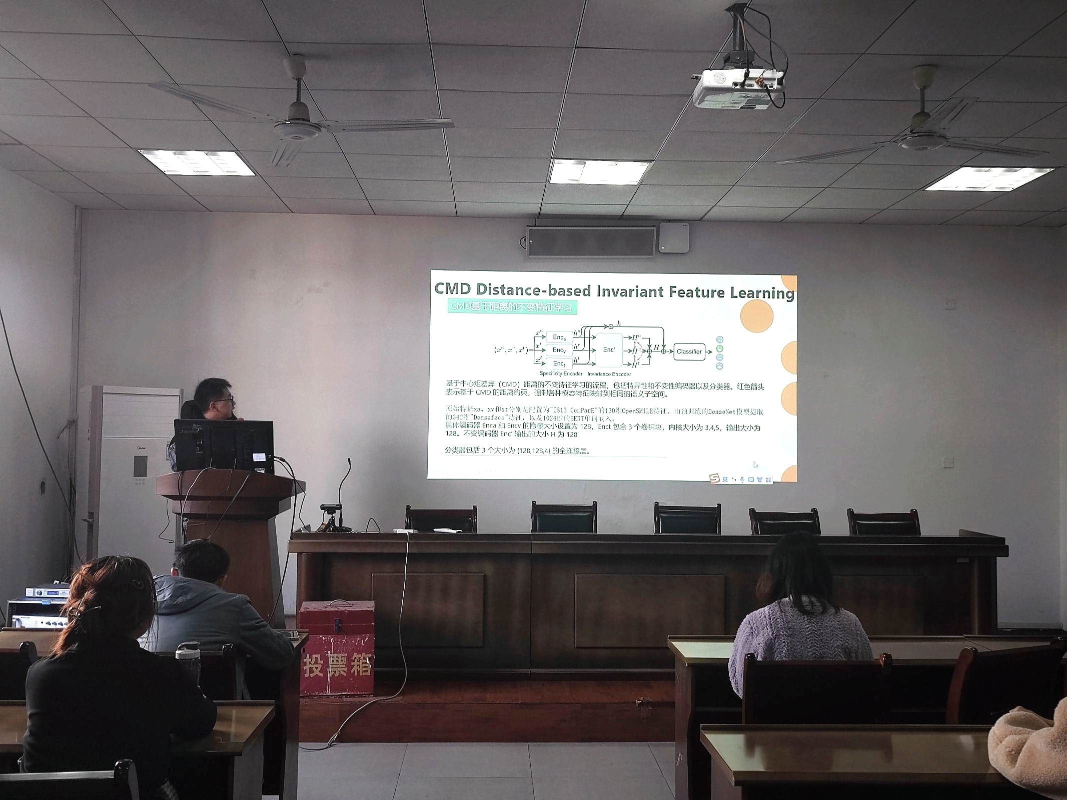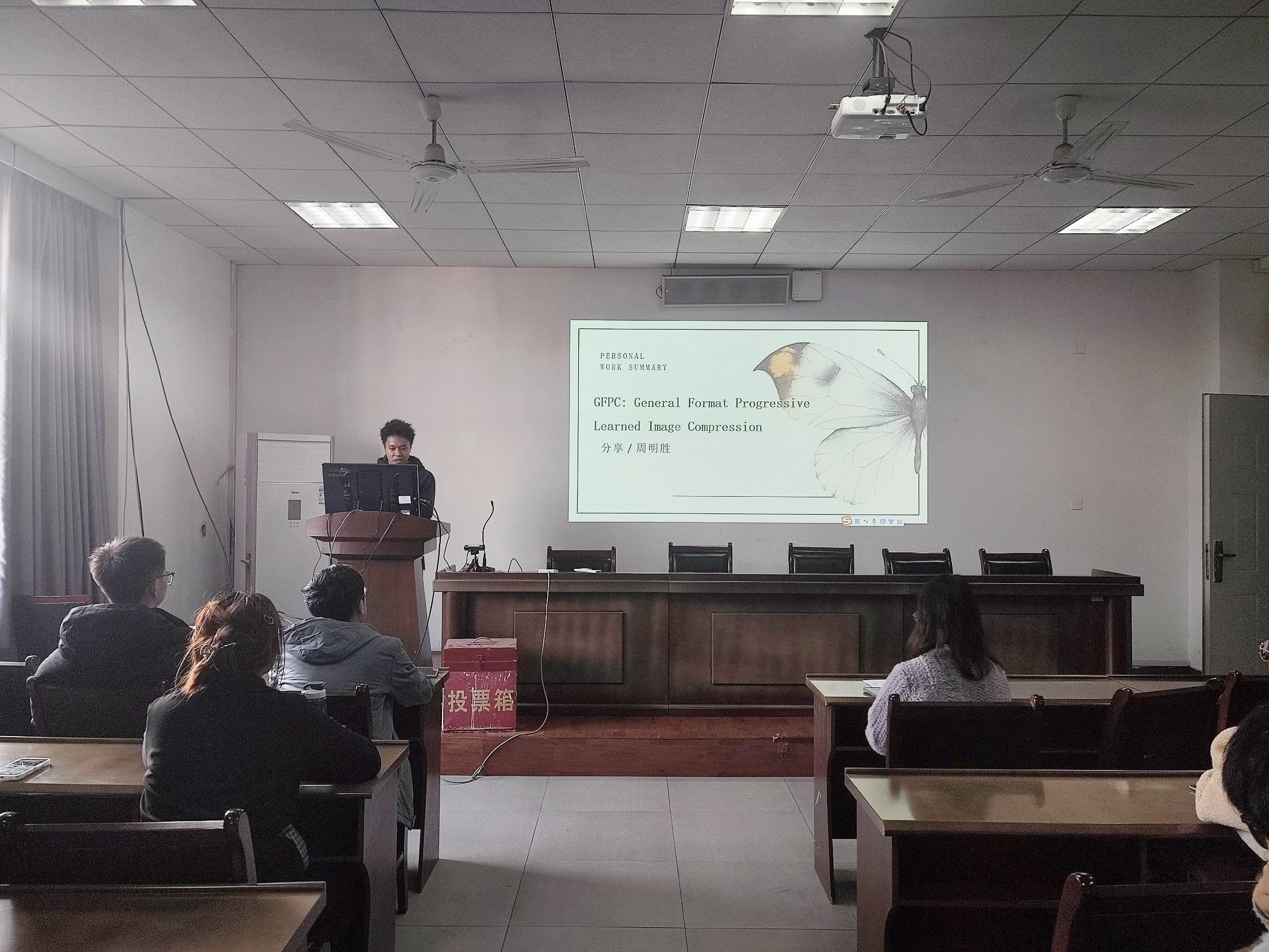随后,2位小组代表分别对各自的研究内容进行了分享,周明胜介绍了“GFPC:通用格式渐进式学习图像压缩”的研究背景、现状及创新点,徐文哲介绍了“利用模态不变量特征在模态缺失的情况下实现稳健的多模态情感识别”的研究进程。两位同志在分享过程中,思维清晰严谨,表现了较好的学术素养。最后主持人杨老师表示作为研究生学生党员,在校期间做好学术研究工作是重中之重,不仅要带头学习党的理论知识,学术研究中也应当起到模范带头作用,希望支部各位同志认真踏实,勤学苦练,真正做到学有所成。