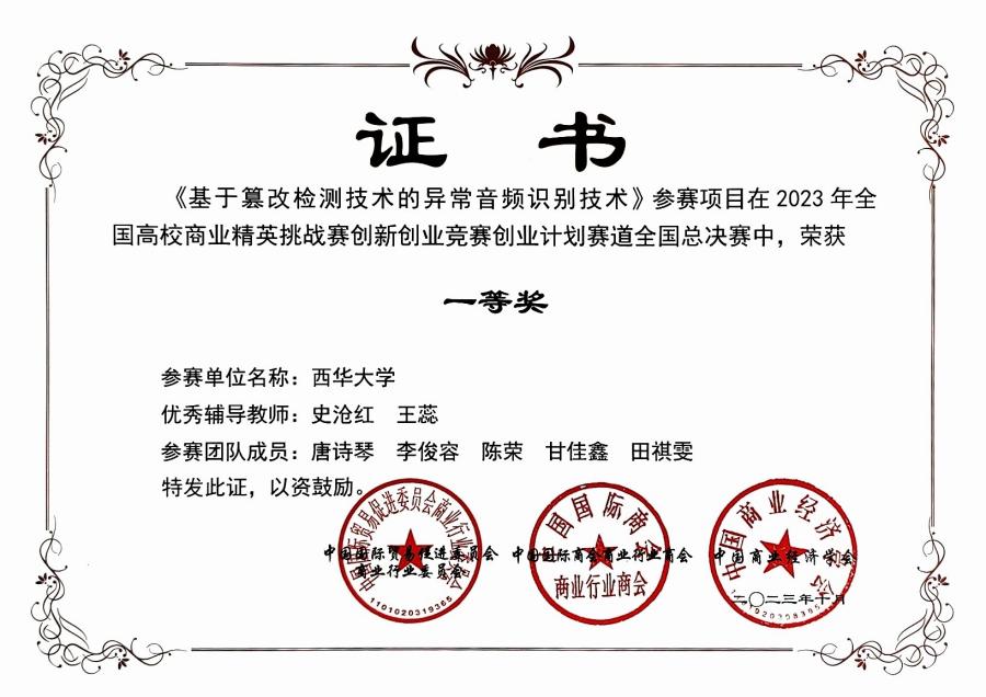 2023年10月21日,由中国贸促会商业行业委员会、中国国际商会商业行业商会和中国商业经济学会共同主办的2023年全国高校商业精英挑战赛创新创业竞赛创业计划赛道全国总决赛顺利举行。本次创业计划赛道全国总决赛共有来自30余个省、直辖市、自治区的300余所高校近万余名师生共同参与。经全国高校商业精英挑战赛组委会组织有关专家评审,共评选出获奖团队1018支,其中,一等奖202项,二等奖524项,三等奖292项。经过激烈的角逐,史沧红老师等人指导的捕风捉音-《基于篡改检测技术的异常音频识别技术》项目荣获全国高校商业精英挑战赛创新创业赛道一等奖。