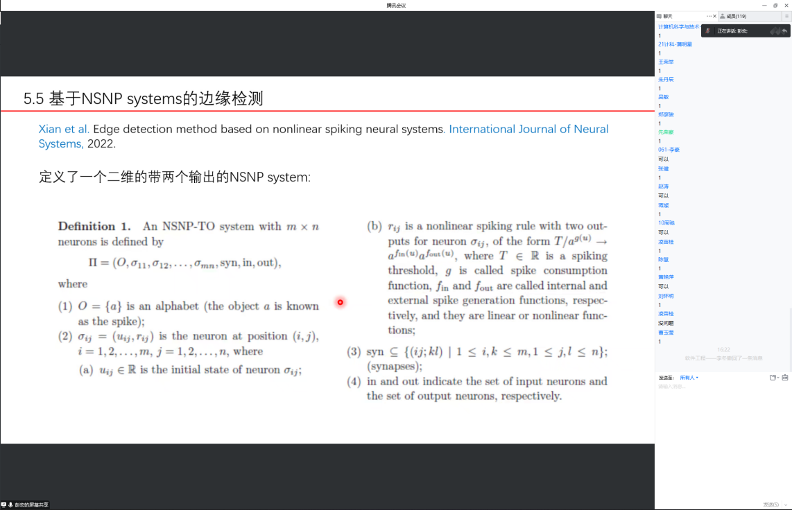 彭宏老师以“脉冲神经型的膜计算模型及其应用”为主题,向大家介绍了脉冲神经型的膜计算模型是启发自生物神经元的脉冲机理。主要介绍脉冲神经模型的几种变体,包括在理论计算方面的进展。重点介绍这些变体在图像处理、时间序列预测及自然语言处理中的应用进展。