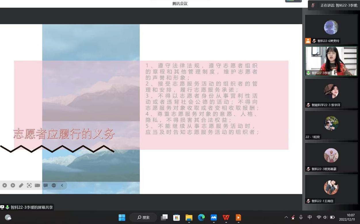此次讲座,通过腾讯会议以PPT的形式向同学们展示,内容分为两个部分,主要包括志愿者服务理念的知识和志愿者技能培训。