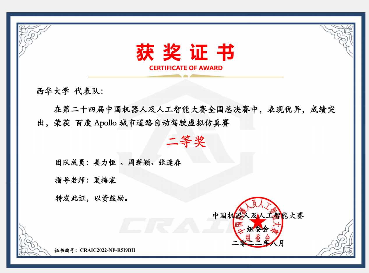 8月25日,第二十四届中国机器人及人工智能大赛组委会公布了全国总决赛获奖名单。计算机与软件工程学院学子姜力恒 、周薪颖、张逢春组成的队伍“代码写的都队”在分赛道“百度Apollo城市道路自动驾驶虚拟仿真赛”中喜获全国二等奖;由甘佳鑫,严雨雨,程皓组成的队伍“阿甘队”喜获省级优秀奖;由张鹏、范宇、罗仟行组成的队伍“AI Warriorv”喜获人工智能创新赛省赛三等奖。
