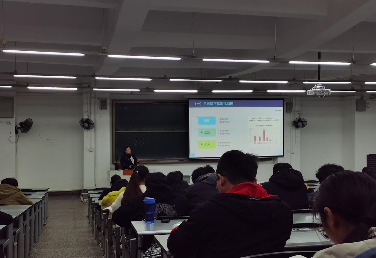 讲座上,陈池老师给同学们普及了“全民数字时代”的概念,陈老师表示,未来几十年,人类社会必然走进智能社会,各行业数字化、自动化进入快速发展期将带来巨大的发展潜力。同时,对企业数字化转型趋势做了详细说明,重点在于突出中国会逐渐步入全民数字化时代。随后,陈老师从共享化、敏捷化、个性化、沉浸化对数字化应用型人才的学习理念进行讲解。