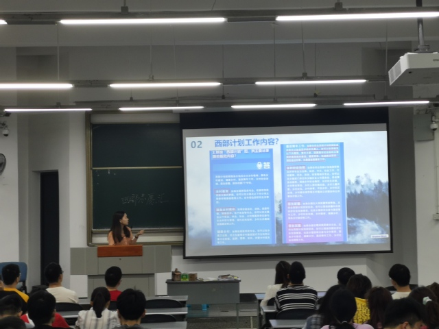 宣讲会中,杨倩老师就西部计划的目的、工作内容、报名条件、报名方式及流程等进行了讲解,鼓励同学们加入到西部计划中,服务西部,为自己的青春梦,也为中国梦的实现贡献自己的力量。刘凤丽老师表示参加西部计划是一件非常有意义的事,希望更多的同学能够加入西部计划,到西部去、到基层去、到祖国最需要的地方去,用这不长不短的时间做一件令自己一生难忘的事。