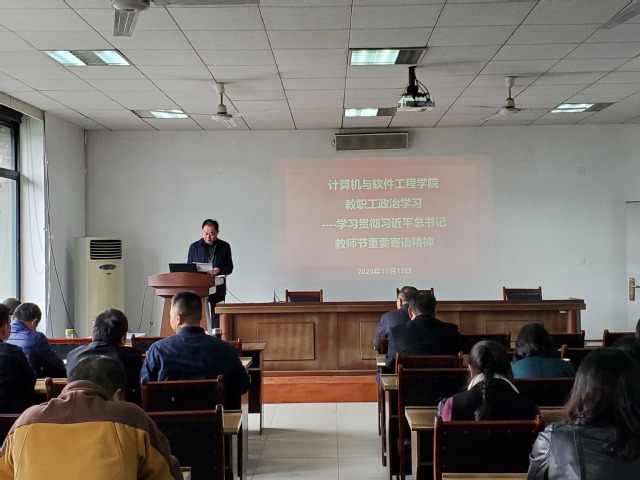 10月15日下午,计算机与软件工程学院在6A-520进行教职工政治学习,专题学习习近平总书记教师节重要寄语精神,会议由学院党委书记黄继红主持。