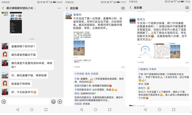 大数据通识教学团队微信群、曾晟珂老师和陈克力老师朋友圈的网上教学经验与体会分享