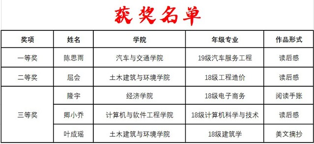 活动从4月6日到4月24日,历时半月有余,同学们读完一本书后,可以任何形式表达自己的感受。参赛选手们认真对待比赛,积极准备作品。最后汽车与交通学院的陈思雨同学荣获第一名、土木建筑与环境学院的屈会和叶成瑶同学荣获第二名、经济学院的隆宇以及计算机与软件工程学院的卿小乔同学的作品荣获第三名。