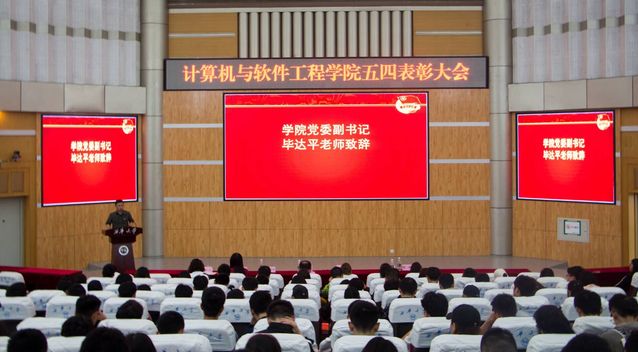 5月8日12:30,计算机与软件工程学院五四表彰大会于四教报告厅隆重举行。学院党委书记黄继红、党委副书记毕达平、学工办主任刘凤丽、团委书记韩静、2018级辅导员盛小兰、学院团委副书记杨倩、申小凤出席本次大会。