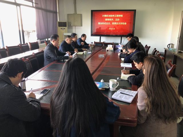 3月28日上午8:30,计算机与软件工程学院结合工作实际,在6A-519会议室开展了“整治形式主义、官僚主义”主题大讨论。学院领导班子、党政办、教学办、学工办全体人员参加会议。