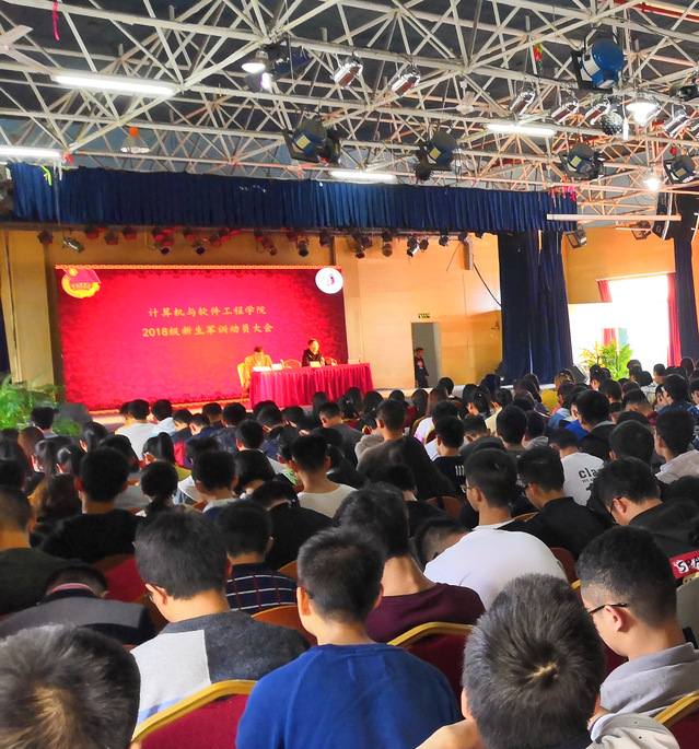 近日,计算机与软件工程学院2018级新生军训动员大会于学生活动中心三楼举行。党委副书记毕达平、新生辅导员赖霞、新生辅导员盛小兰及全体2018级新生参与本次动员大会。