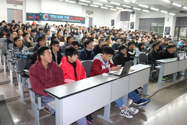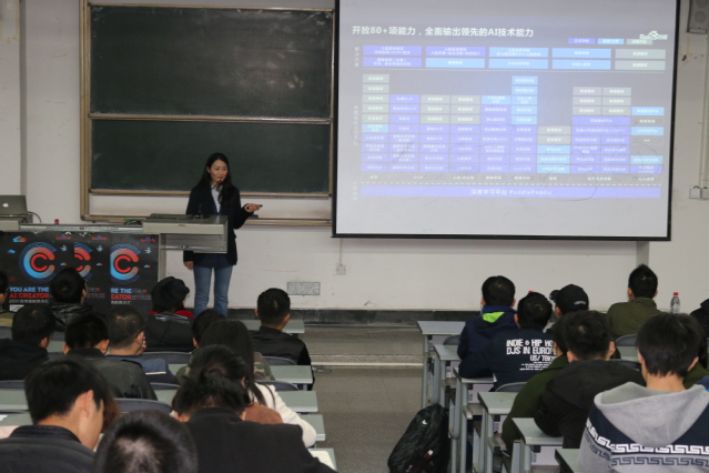 活动中,计女士首先介绍了百度在即将到来的AI时代所具备的技术、人才和数据三方面的优势,为同学们讲解了AI行业的发展历程、分享了百度AI技术成果,为同学们指明了AI的前行方向,激发同学们对AI的热情。接着,计女士从百度大厦内现有的AI技术举例,例如刷脸即可进门等,让我们真实的感受到未来AI将会无处不在。随后,计女士介绍了百度AI开放生态战略中的DUEROS、Apollo、百度大脑和智能云四个平台,其中,主要从语音识别、语音合成、人脸识别技术等方面与同学们展开互动,使大家切实体会到AI技术。最后,计女士为大家分享了深度学习平台PaddlePaddle,她举了一个很形象的例子来强调深度学习的重要性,她说:“月薪25万和年薪25万的区别就在于深度学习”。在活动结束时,计女士表达了对同学们的殷切希望,希望大家能够紧跟时代的脚步,不做旁观者,而要做一个参与者、奉献者!