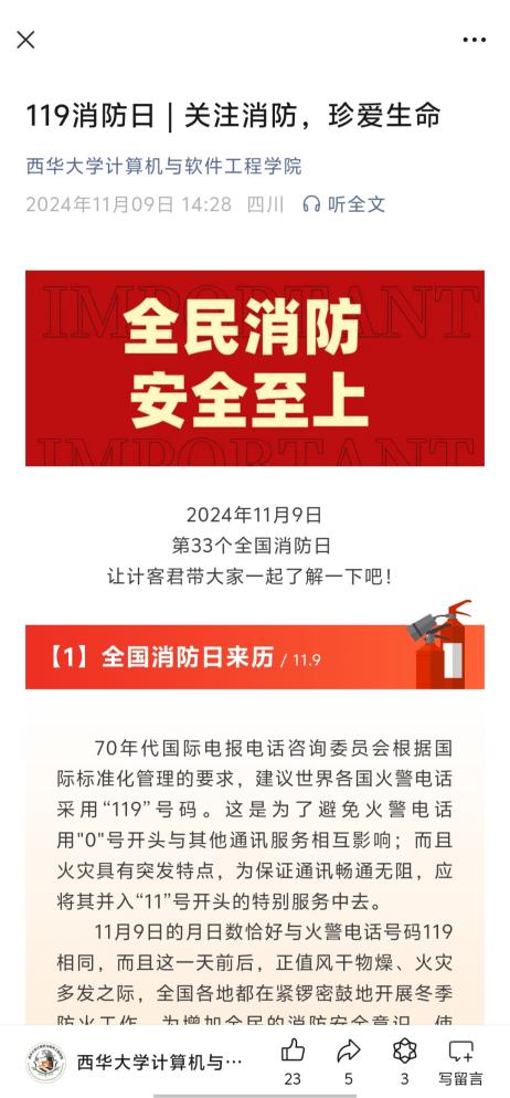 2024年11·9消防月宣传活动,计算机与软件工程学院聚焦媒体宣传、宣传阵地、安全教育三个环节,开展了形式多样、内容丰富的系列活动。活动覆盖了全院3000余名学生、120余名教师,宣传效果良好,宣传成果丰富。学院师生在各项活动中深刻认识到消防安全的重要性,增强了消防安全意识,提高了消防应急能力。学院将继续加强消防宣传工作,常态化开展消防安全教育,预防为主,为师生创造更加安全、和谐的工作学习环境。