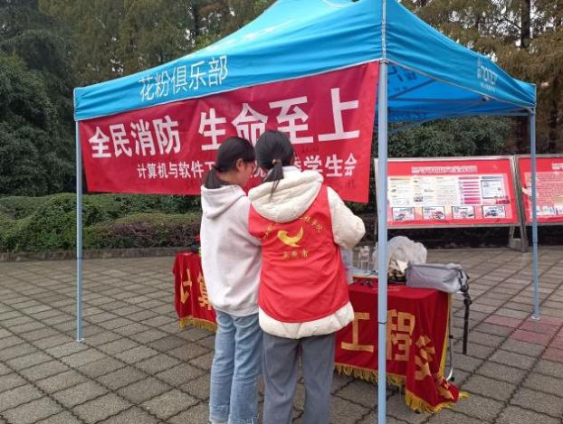 学院组织学生会成员在郫都校区第四教学楼门口开展了“119消防知识问答”活动。活动主要通过问答方式展开,邀请往来学生参与,向他们提出消防安全相关的问题,包含火灾扑救、火灾报警、灭火器使用、火场逃生技巧等方面,并为正确回答问题的同学送上小礼品,邀请参与同学在“全民消防,生命至上”横幅上郑重签字。