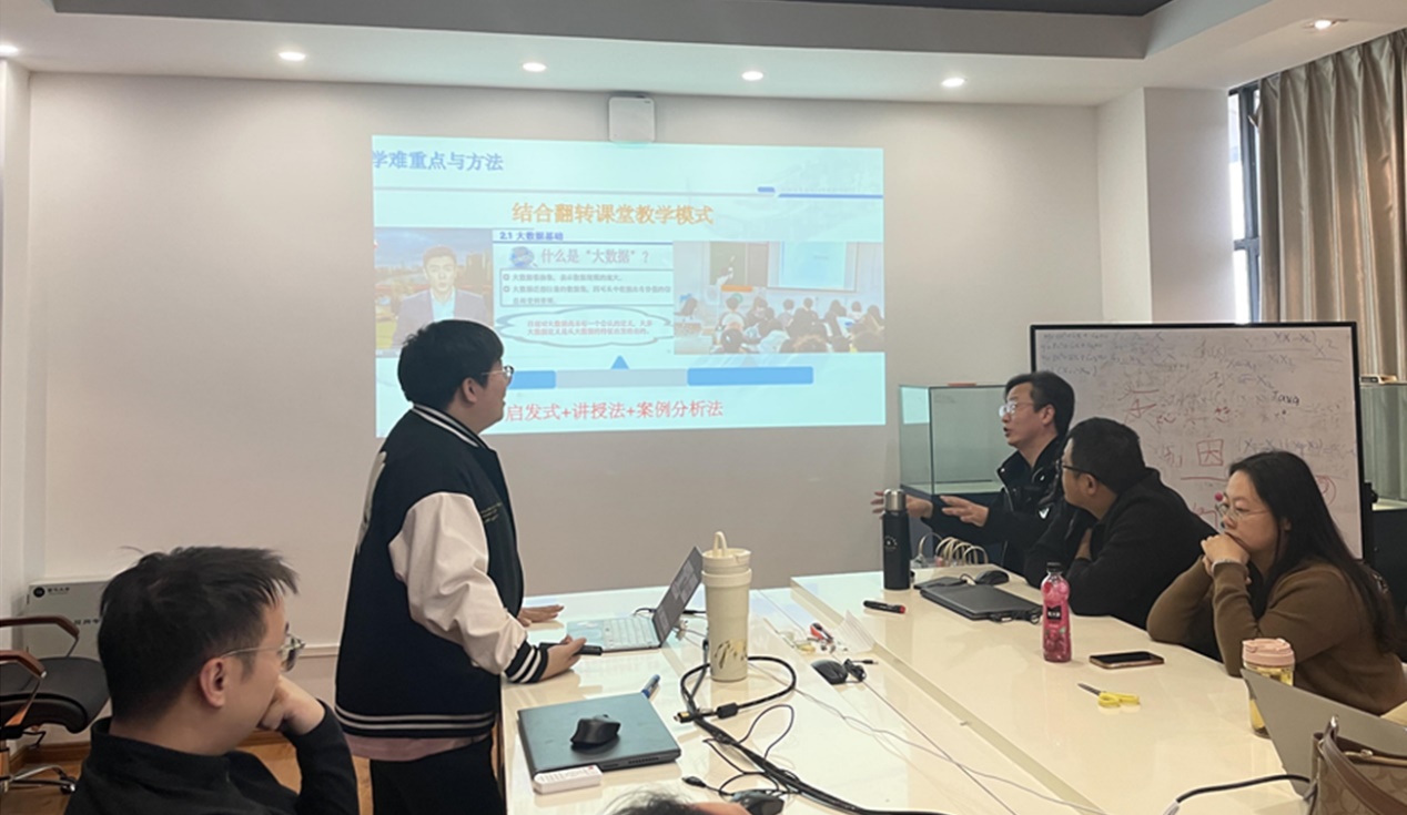 1、首先是新进教师刘冰进行了说课演练,完成了《大数据与数据分析》中大数据基础这一章节的说课讲解,并对自己教学过程进行了反思。