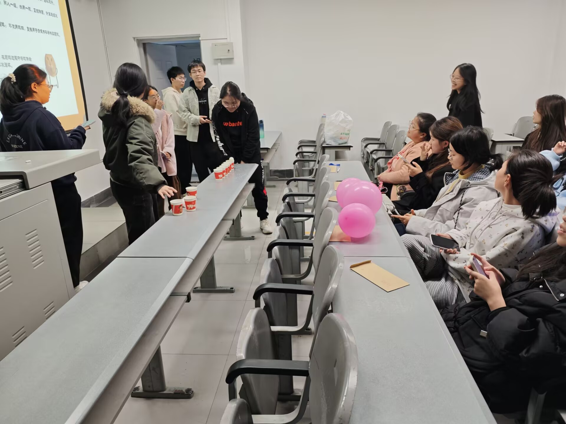 活动现场气氛热烈,精心设置了吹气球比大小、气球传纸杯和纸杯传乒乓球等几个特色项目。在气球传纸杯环节,同学们积极参与其中,用气球夹着纸杯,像肩负使命的勇士般小心翼翼前行。有的小组配合默契,一路顺畅;有的小组则状况频出,气球滑落、纸杯落地,却也引得大家笑声连连。纸杯传乒乓球项目同样精彩,同学们全神贯注,通过纸杯的传递让乒乓球“跳跃”前进,展现出了高度的专注和团队协作精神。