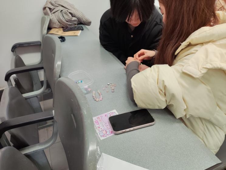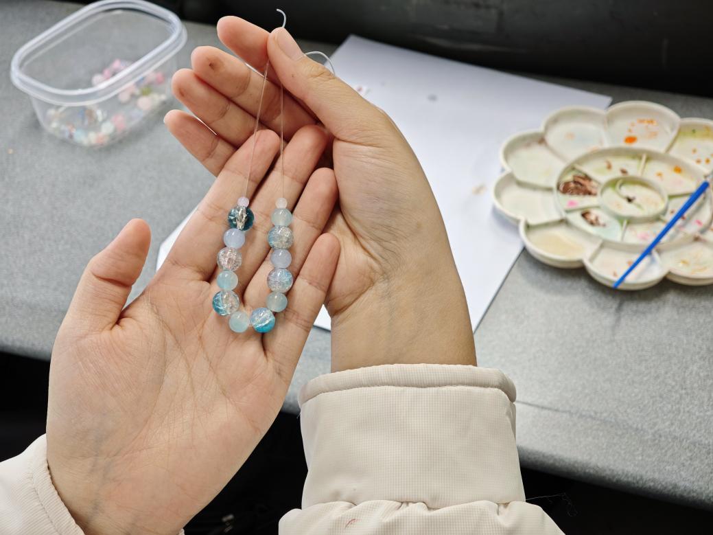 活动现场,串珠等丰富物料整齐陈列,舒缓音乐流淌营造温馨氛围。大家从选料到创作,一步步将创意落地。同学们专注投入,穿引间,压力随指尖动作悄然释放,原本普通的材料,在巧手下蜕变成各式各样的串珠手链,每一样都是属于自己的独特作品。