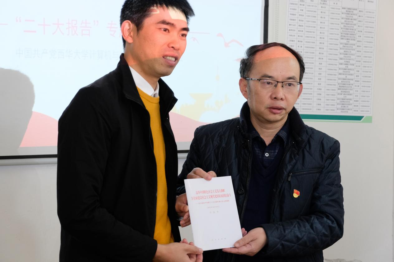 亚军书记最后做了总结发言,肯定了两位扶贫干部的工作,并赠送了《高举中国特色社会主义伟大旗帜 为全面建设社会主义现代化国家而团结奋斗》的学习手册,驻村干部雷云中分享了他的驻村心得,表示要将党的二十大精神和驻村实际事务相结合,和水堰口村67名党员做好工作,一起带动村民们过上好日子。